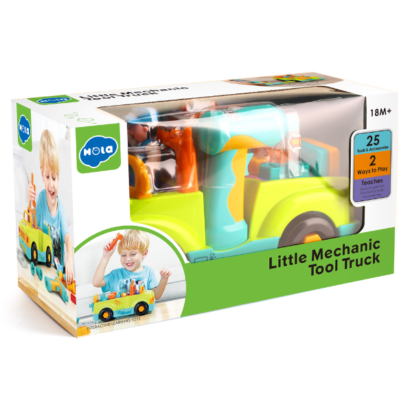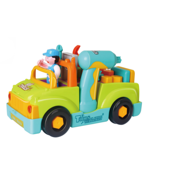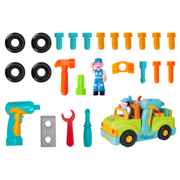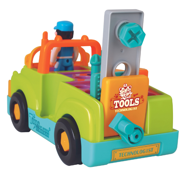 Această jucărie interactivă este perfectă pentru micii meșteșugari. Vine cu patru unelte diferite: un burghiu, un ciocan, o cheie și o șurubelniță. Toate uneltele pot fi folosite pentru a repara vehiculul sau pentru a lucra cu accesoriile incluse în set. Unele dintre aceste accesorii includ șuruburi și cuie care pot fi organizate în compartimentele speciale ale camionului.