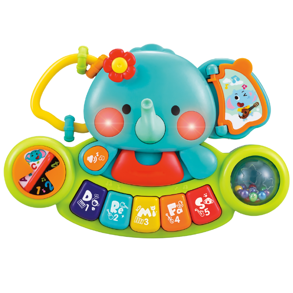 Jucăria pian "Elefant" este destinată copiilor de la 6 luni. Este echipată cu mai multe detalii interactive și mobile, care ajută la dezvoltarea dexterității degetelor și a motricității fine. În plus, această jucărie ajută copilul să exploreze muzica și să învețe prin joc.