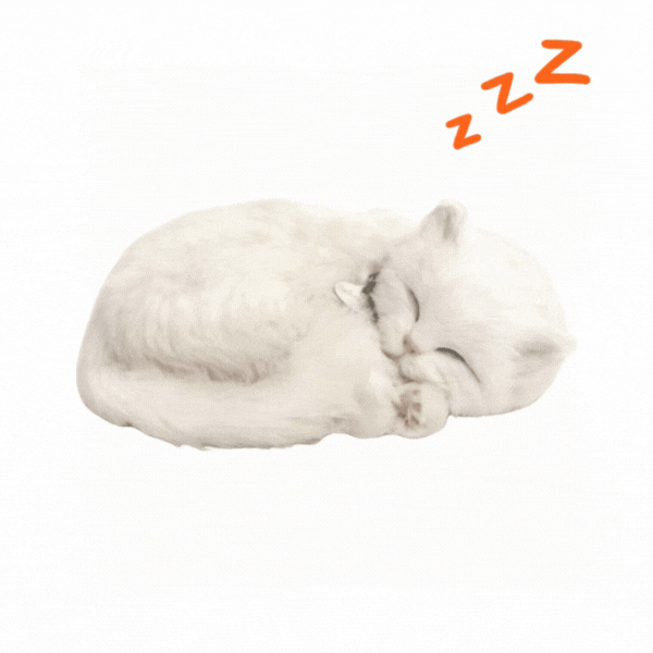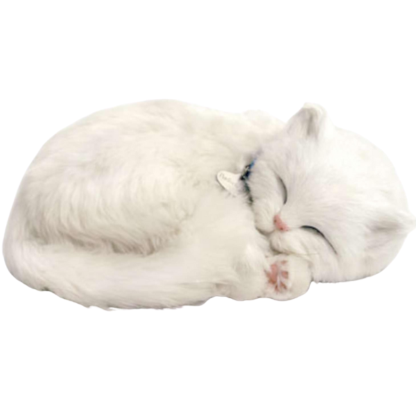 Micuța pisicuță albă doarme liniștit, iar mișcarea subtilă a pieptului adaugă un plus de realism. Blana este realizată din 100% fibră sintetică de înaltă calitate, fiind extrem de moale și plăcută la atingere.